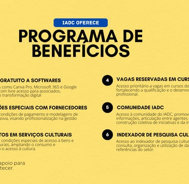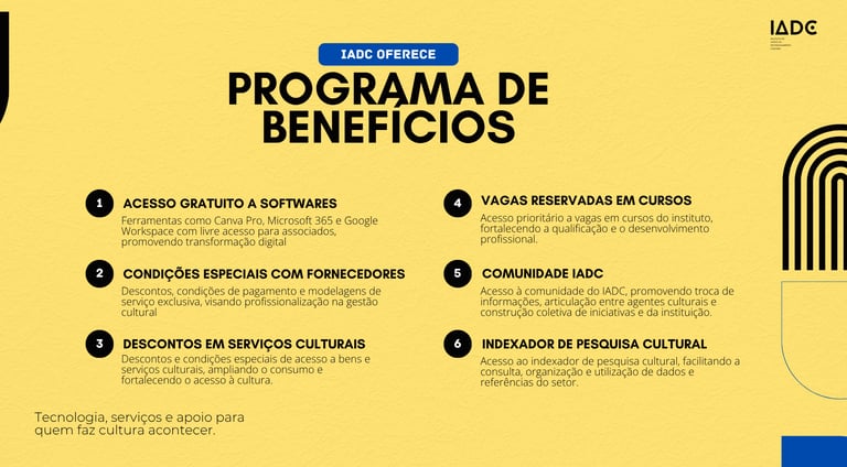 Visando ampliar o acesso de artistas e produtores culturais a serviços, tecnologias e ferramentas essenciais, o Programa de Benefícios do IADC oferece acesso gratuito a softwares estratégicos, condições especiais junto a fornecedores de soluções culturais, administrativas e operacionais, além de descontos em serviços que impulsionam a produção, circulação e valorização da arte e da cultura.